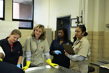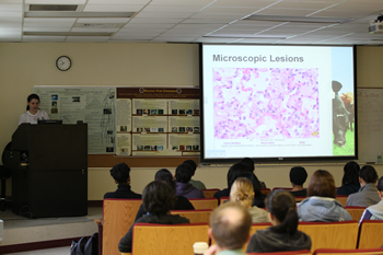 Concerning a third Department goal, faculty members are engaged in diagnostic service support for clinicians in the Veterinary Teaching Hospital (VTH) within the Departments of Large Animal Medicine and Small Animal Medicine. Additionally, they provide diagnostic support to funded intramural and extramural research projects and surgical pathology services to regional veterinarians. The veterinary diagnostic services is composed of laboratories of necropsy, histopathology, clinical pathology/parasitology, microbiology, and immunology. The reports generated from these laboratories are critical to accurate clinical diagnosis, prognosis, and therapy in patients. In addition to providing an invaluable service to the college and to the community, the diagnostic service activities of the departmental faculty provide an excellent source of teaching materials. Daily selected clinical cases serve as "hands-on" instructional material for use in a "seminar-type" learning process which greatly enhances the students' diagnostic abilities and understanding of disease processes.